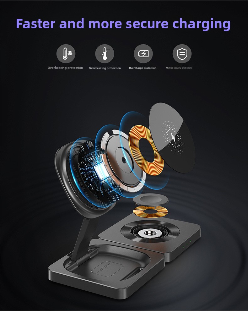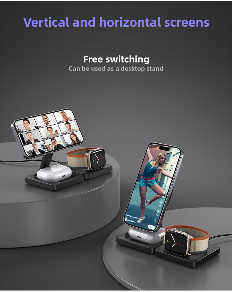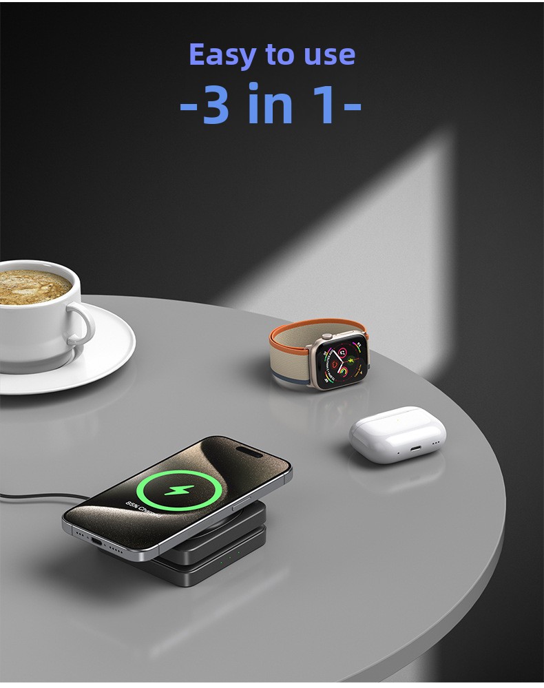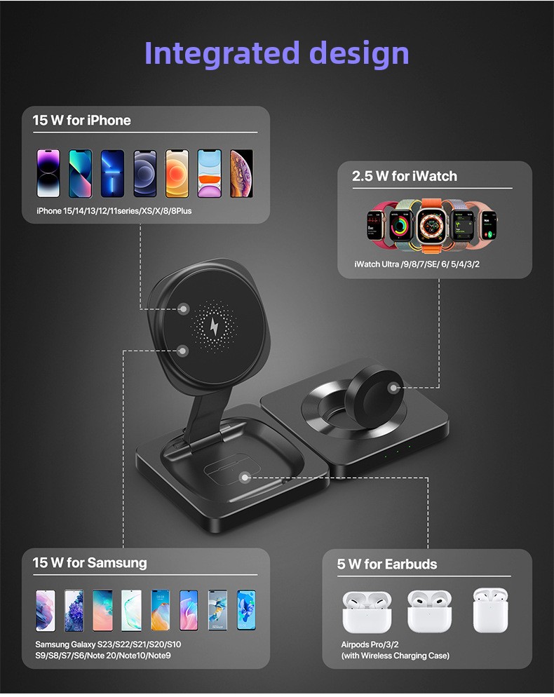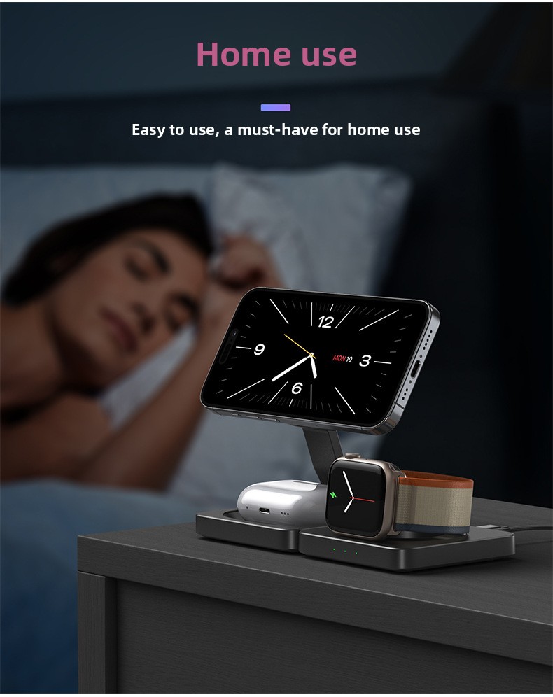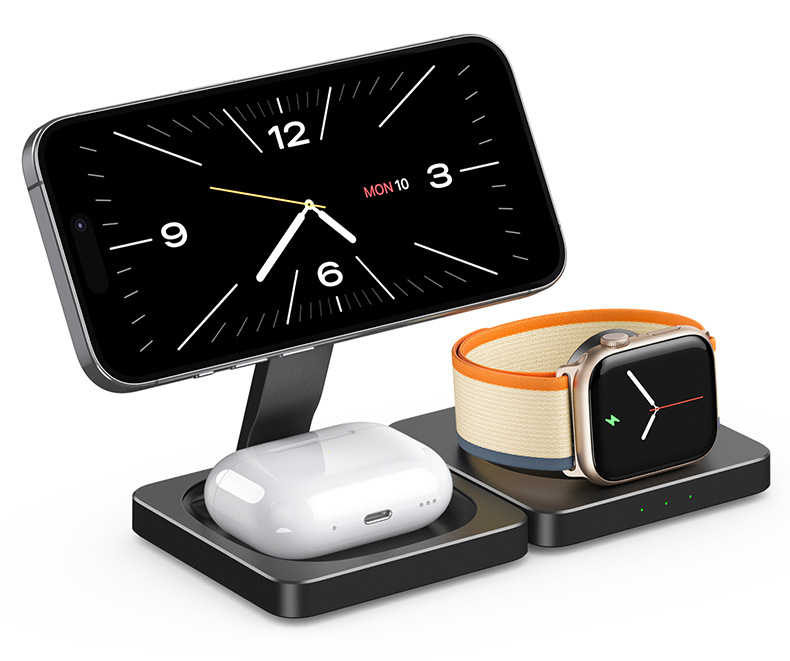 Triple Device Charging: Simultaneously charges Apple phones, watches, and wireless earbuds with a single base.